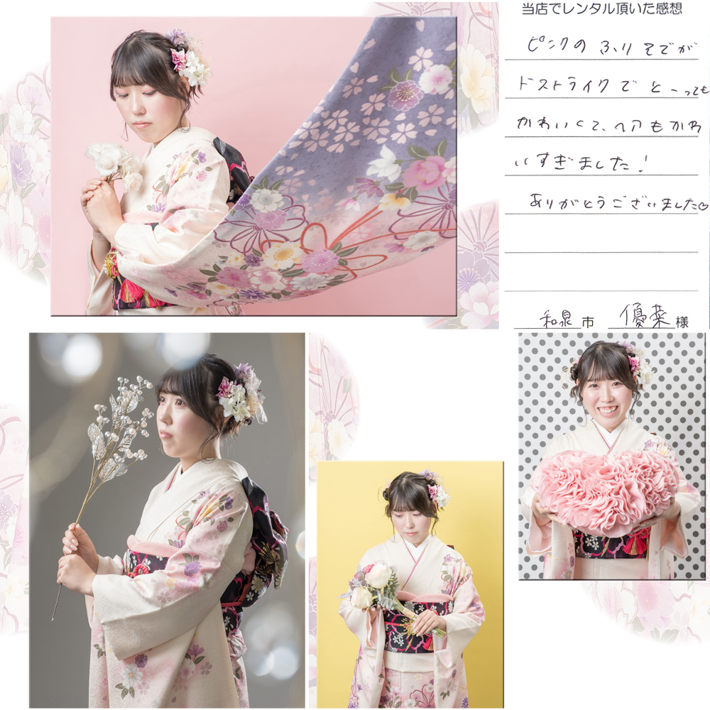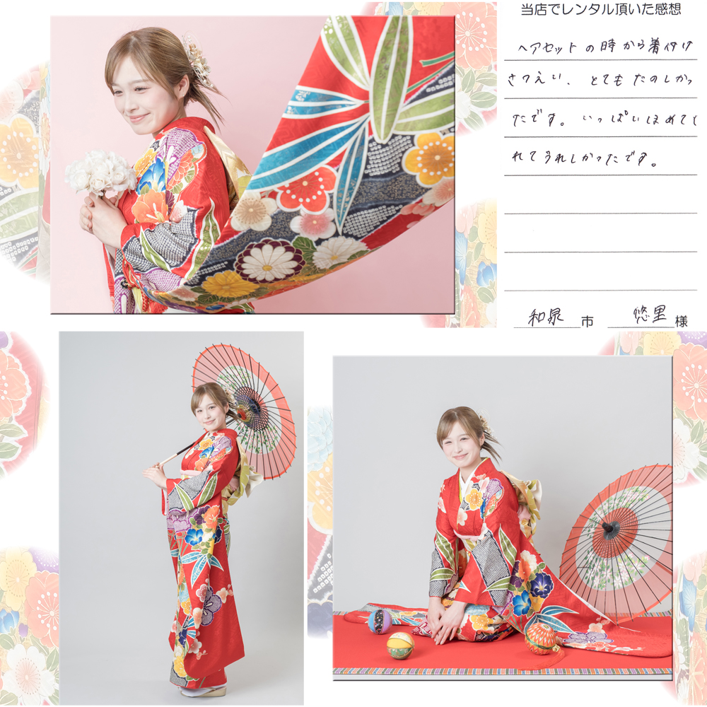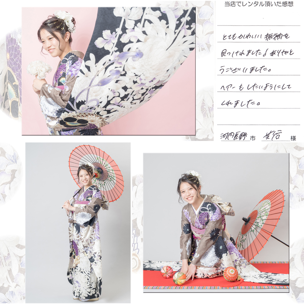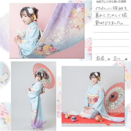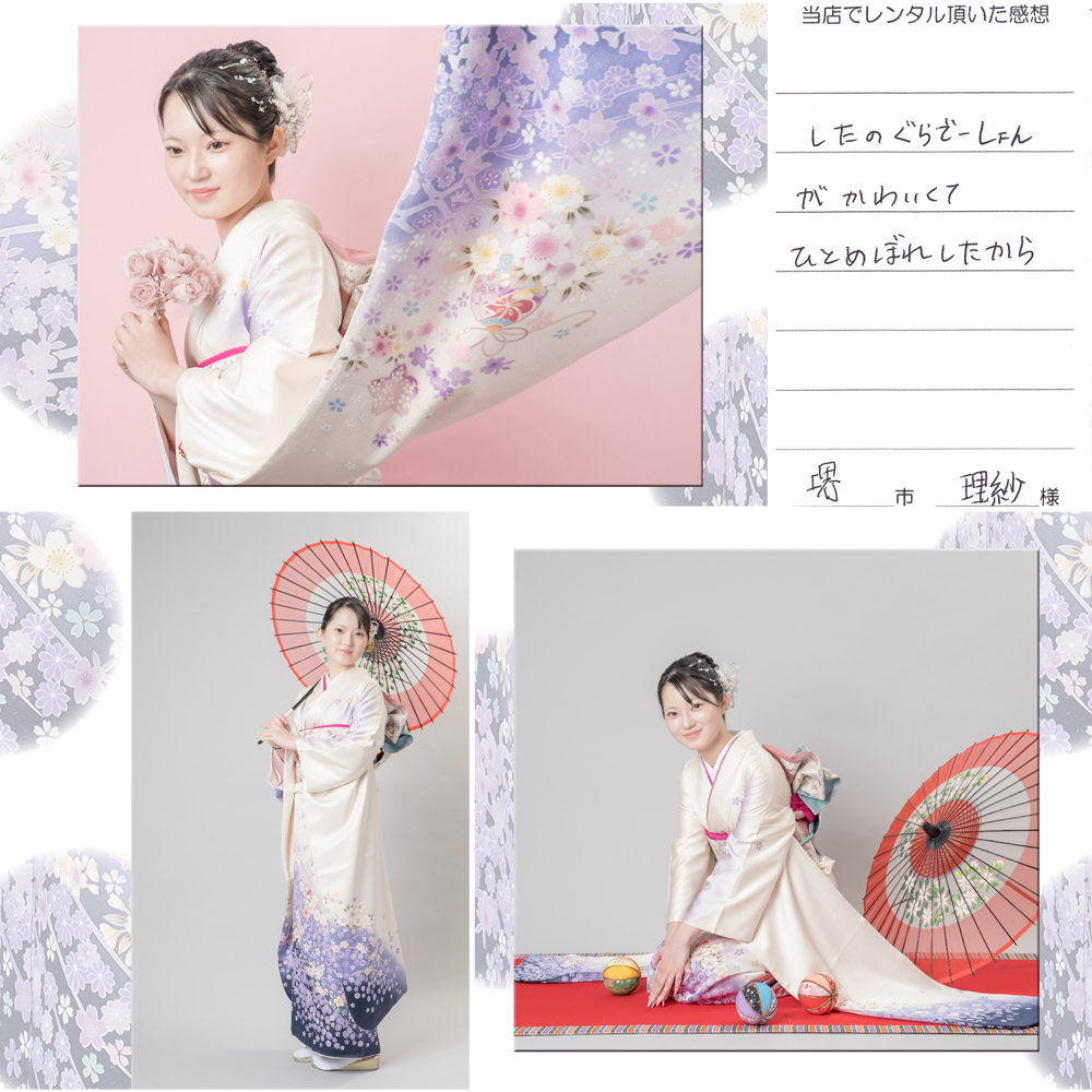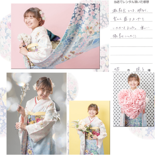 成人式振袖(せいじんしきふりそで),結婚式振袖(けっこんしきふりそで),卒業式袴(そつぎょうしきはかま),訪問着(ほうもんぎ),留袖(とめそで),七五三(七歳着物,五歳袴,三歳被布),産着(うぶぎ),和装小物(わそうこもの)