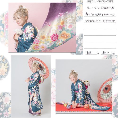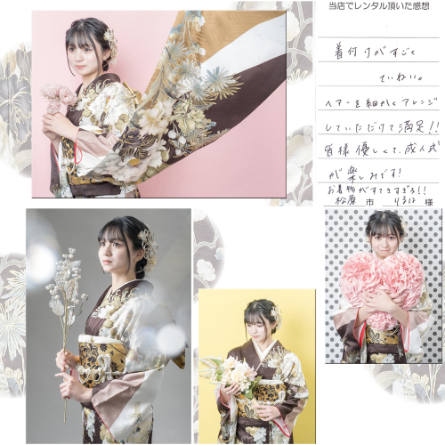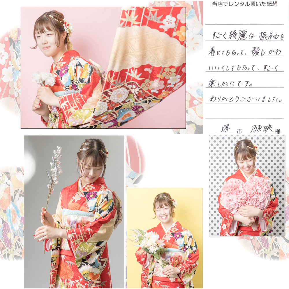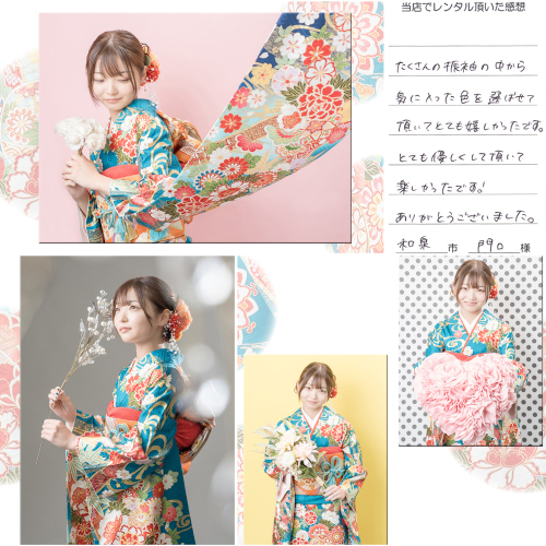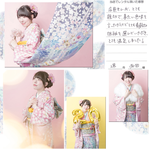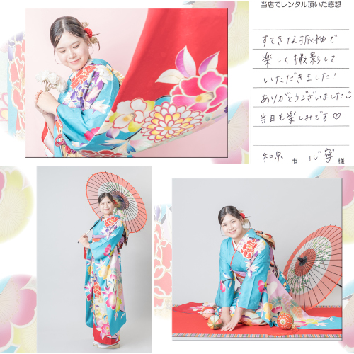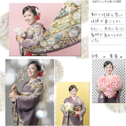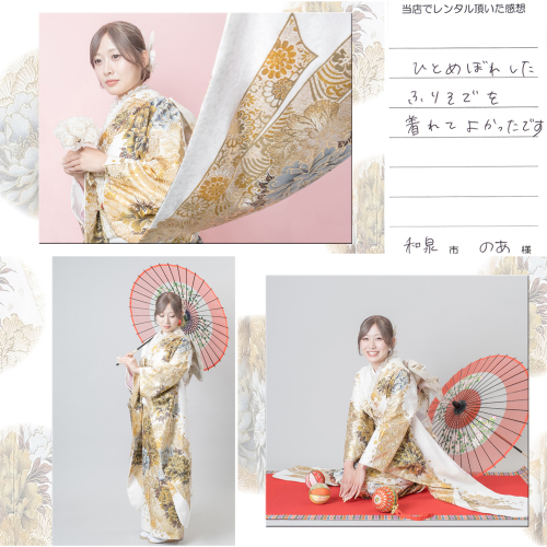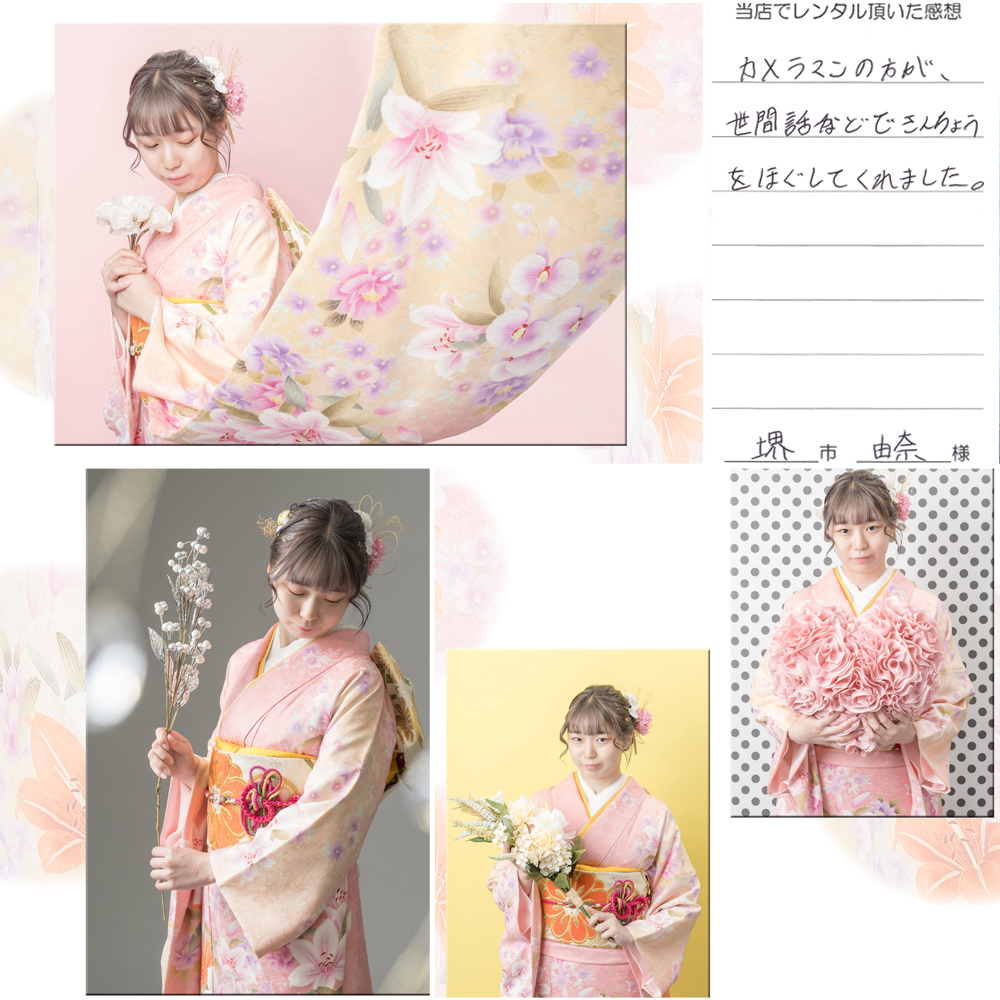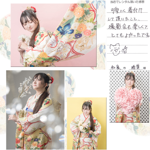 成人式振袖(せいじんしきふりそで),結婚式振袖(けっこんしきふりそで),卒業式袴(そつぎょうしきはかま),訪問着(ほうもんぎ),留袖(とめそで),七五三(七歳着物,五歳袴,三歳被布),産着(うぶぎ),和装小物(わそうこもの)