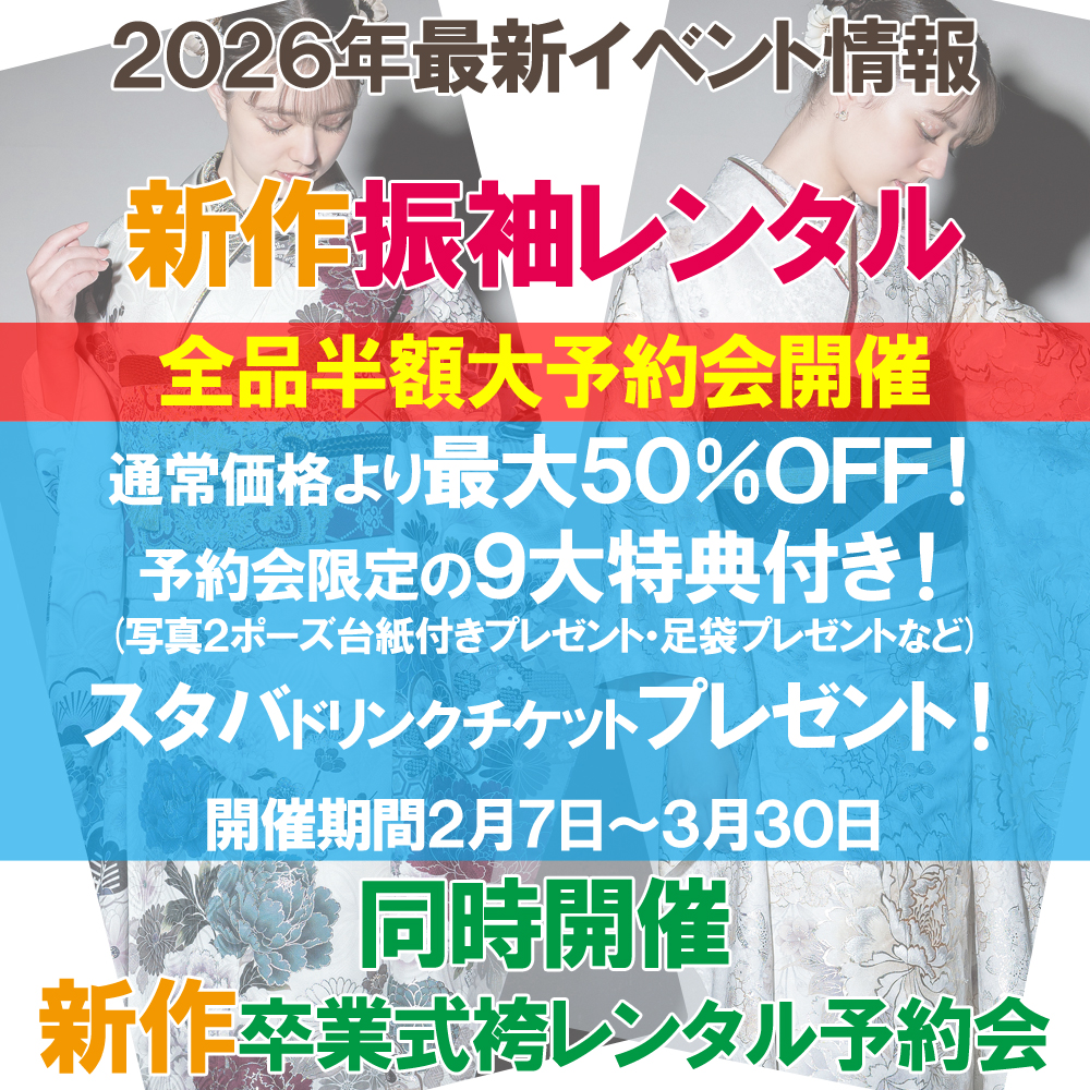 成人式振袖(せいじんしきふりそで),結婚式振袖(けっこんしきふりそで),卒業式袴(そつぎょうしきはかま),訪問着(ほうもんぎ),留袖(とめそで),七五三(七歳着物,五歳袴,三歳被布),産着(うぶぎ),和装小物(わそうこもの)