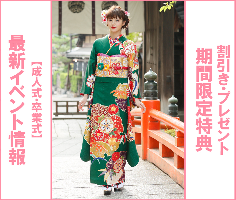 成人式振袖(せいじんしきふりそで),結婚式振袖(けっこんしきふりそで),卒業式袴(そつぎょうしきはかま),訪問着(ほうもんぎ),留袖(とめそで),七五三(七歳着物,五歳袴,三歳被布),産着(うぶぎ),和装小物(わそうこもの)