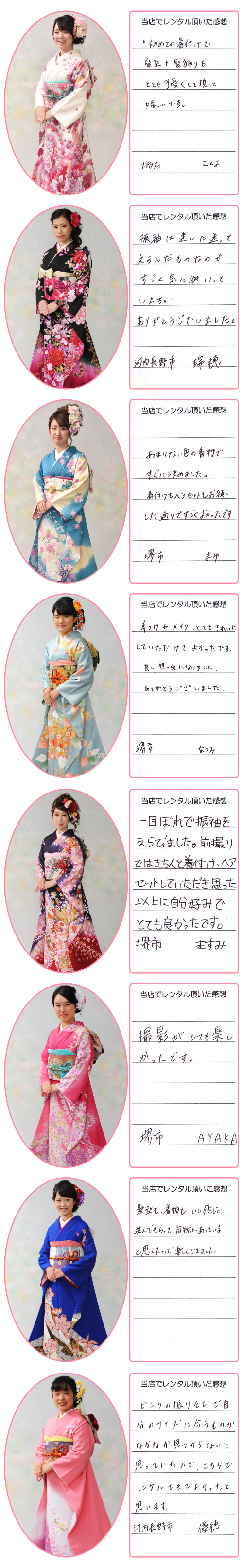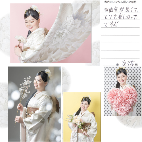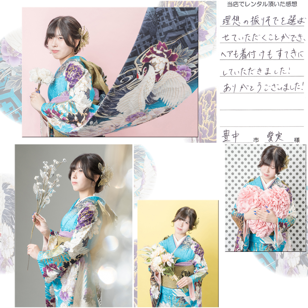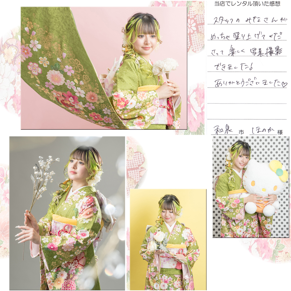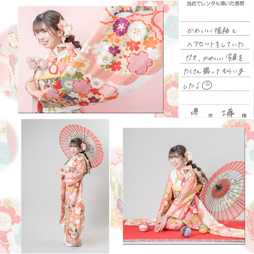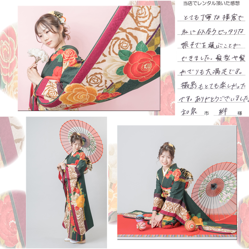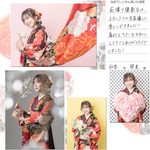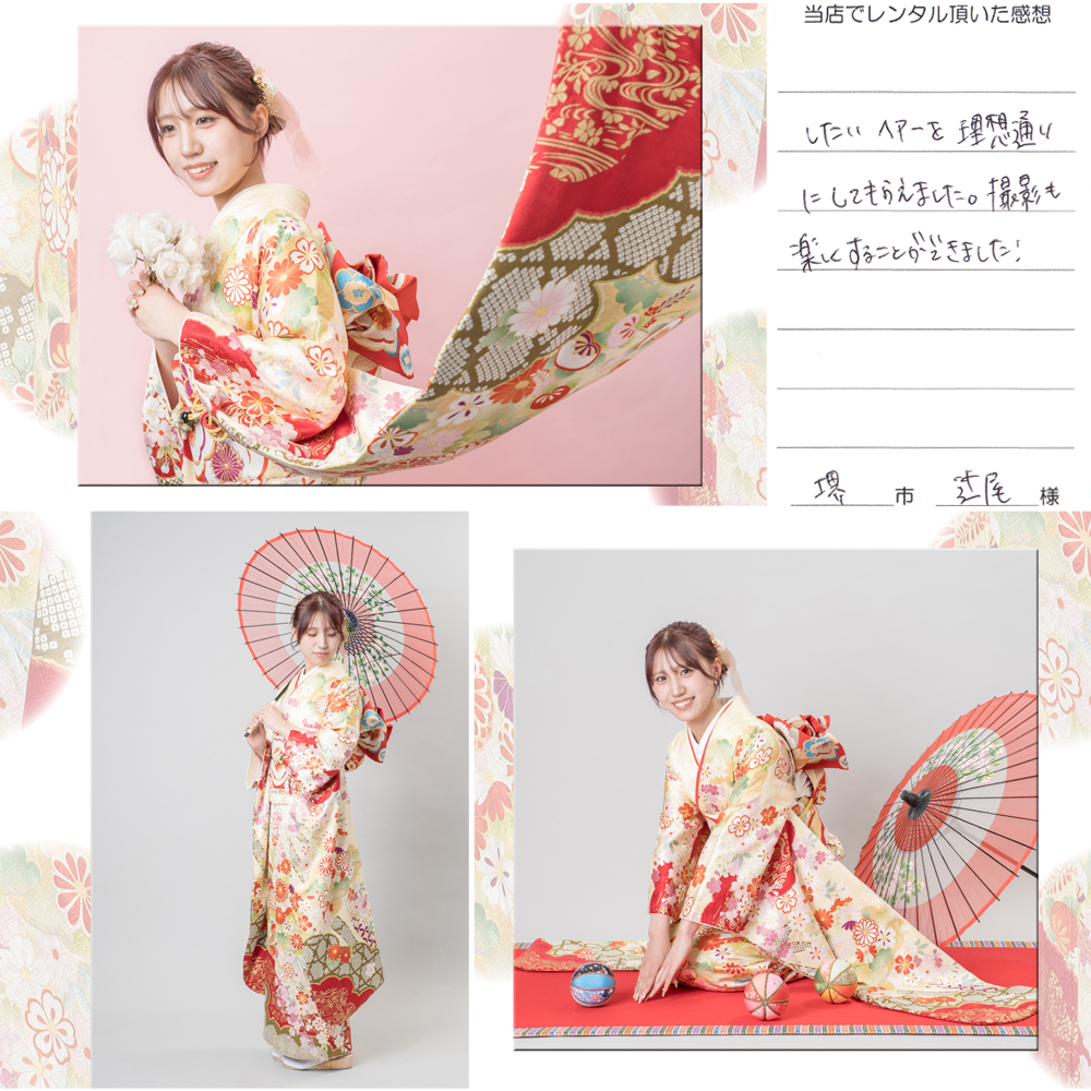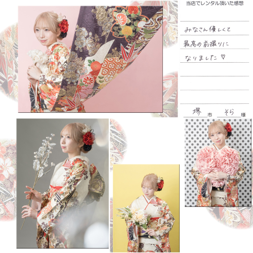 成人式振袖(せいじんしきふりそで),結婚式振袖(けっこんしきふりそで),卒業式袴(そつぎょうしきはかま),訪問着(ほうもんぎ),留袖(とめそで),七五三(七歳着物,五歳袴,三歳被布),産着(うぶぎ),和装小物(わそうこもの)