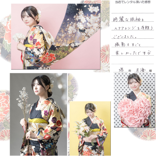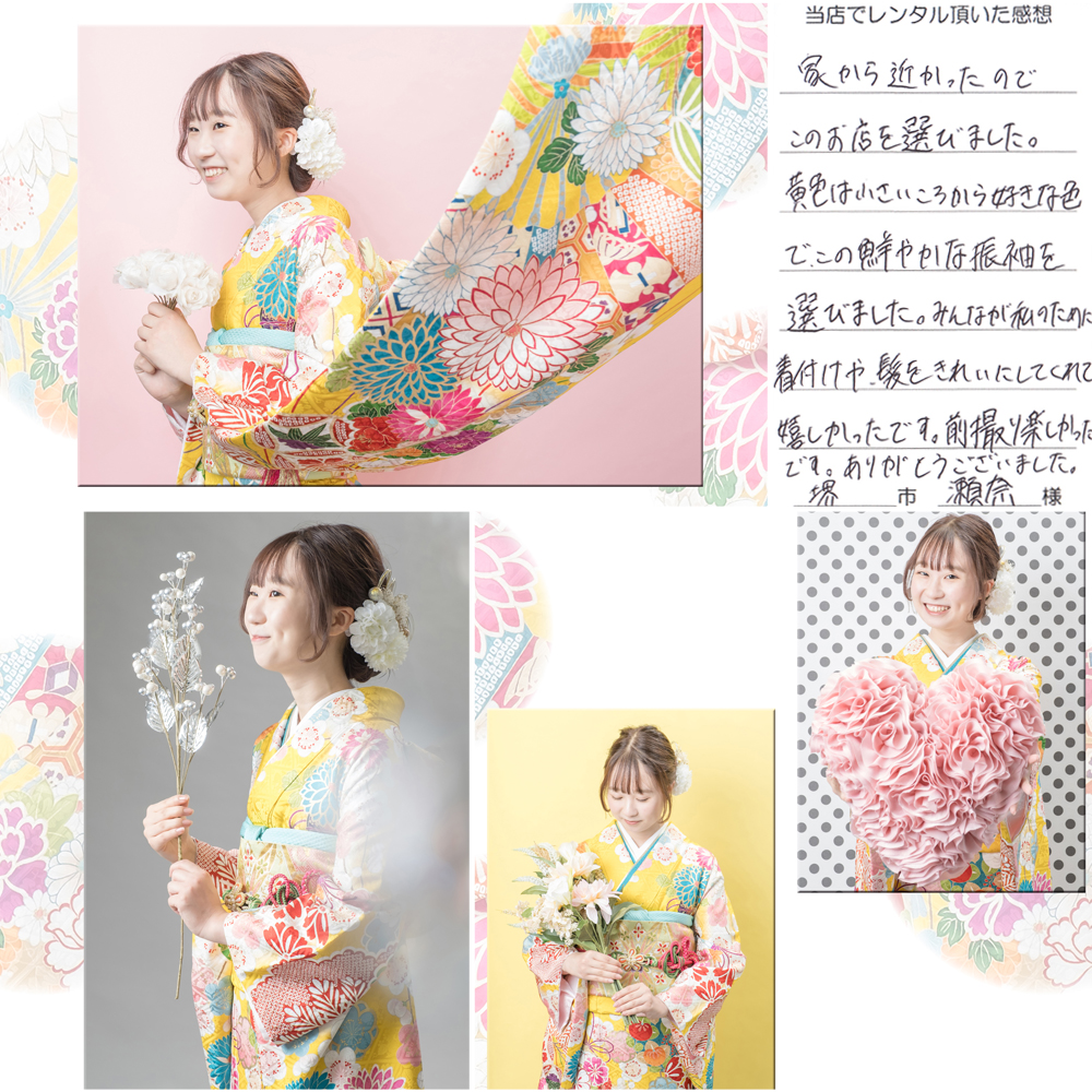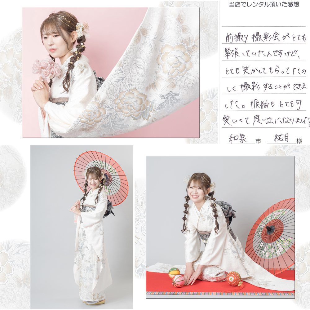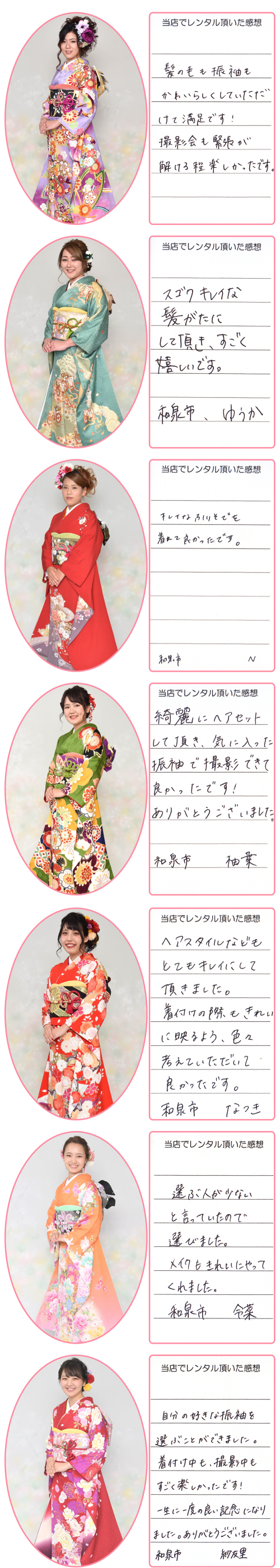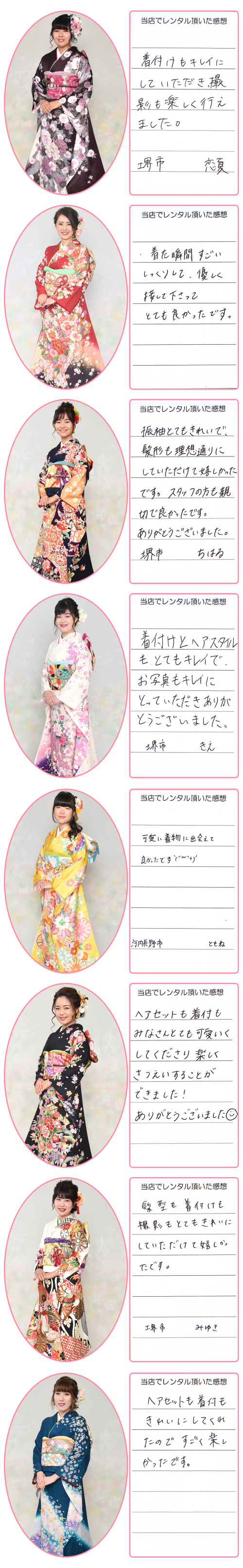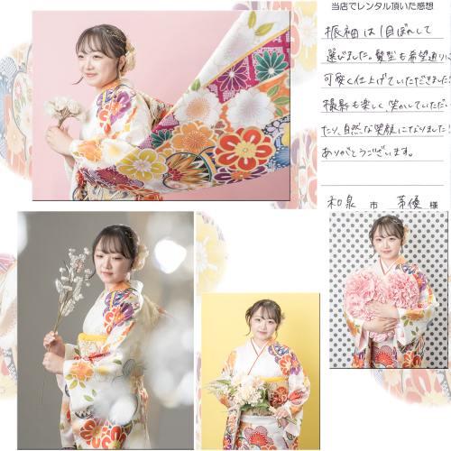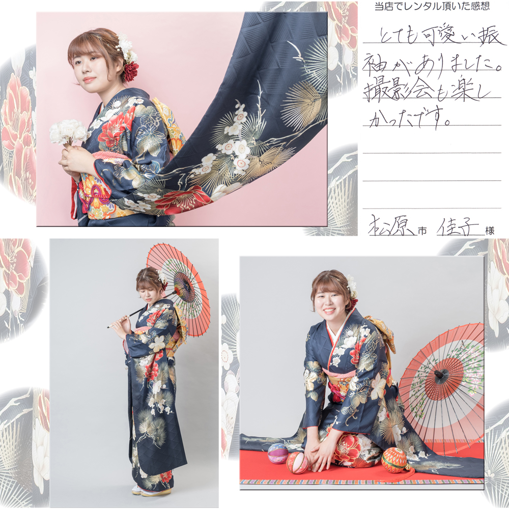 成人式振袖(せいじんしきふりそで),結婚式振袖(けっこんしきふりそで),卒業式袴(そつぎょうしきはかま),訪問着(ほうもんぎ),留袖(とめそで),七五三(七歳着物,五歳袴,三歳被布),産着(うぶぎ),和装小物(わそうこもの)
