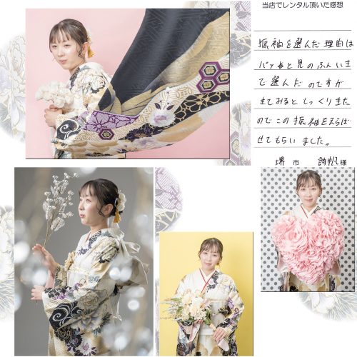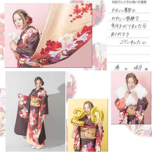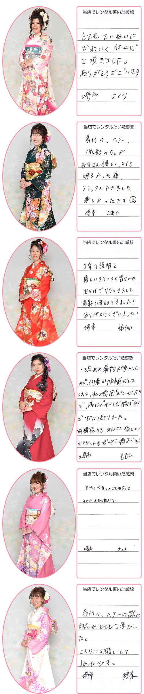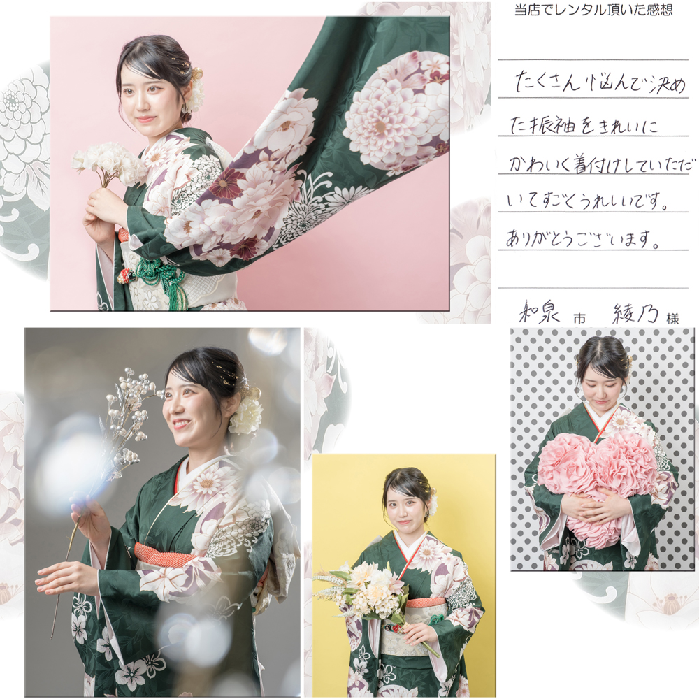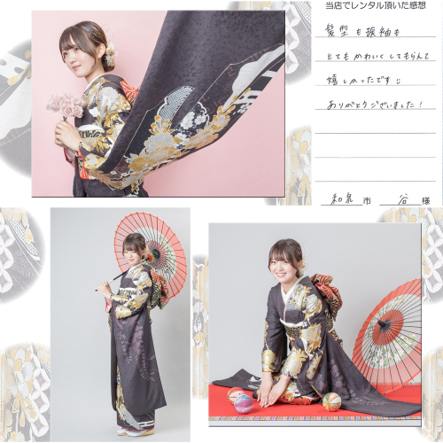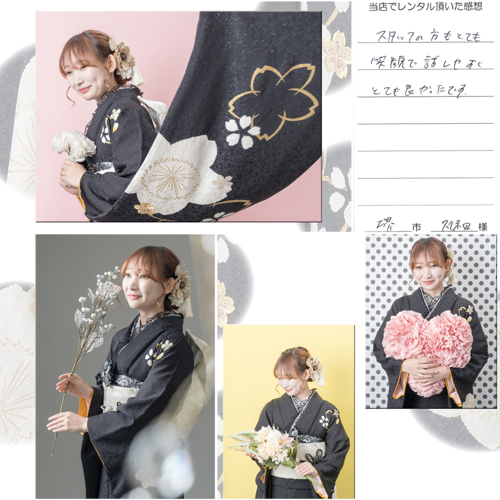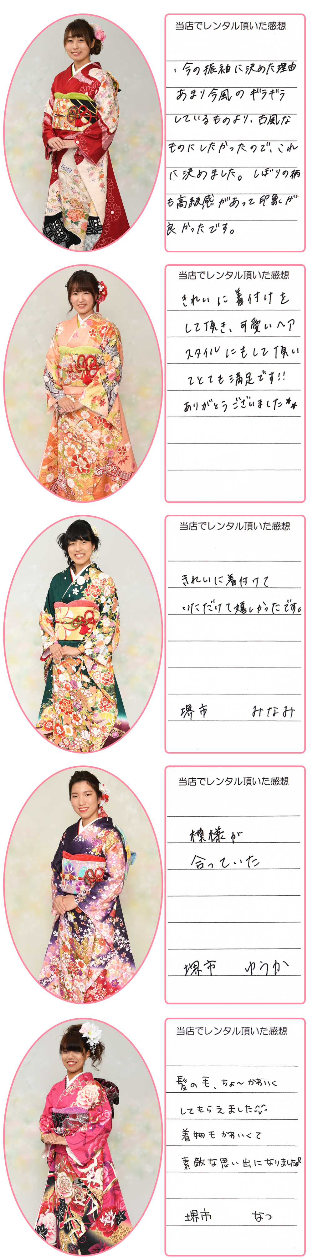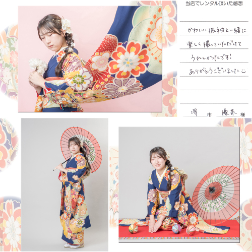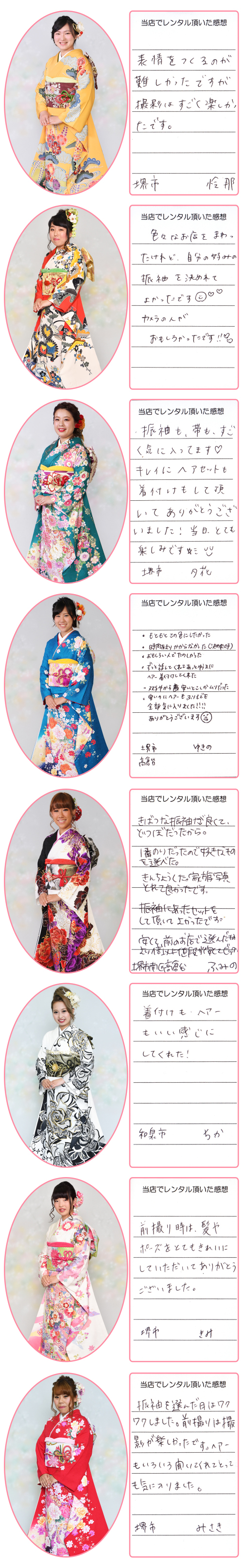 成人式振袖(せいじんしきふりそで),結婚式振袖(けっこんしきふりそで),卒業式袴(そつぎょうしきはかま),訪問着(ほうもんぎ),留袖(とめそで),七五三(七歳着物,五歳袴,三歳被布),産着(うぶぎ),和装小物(わそうこもの)